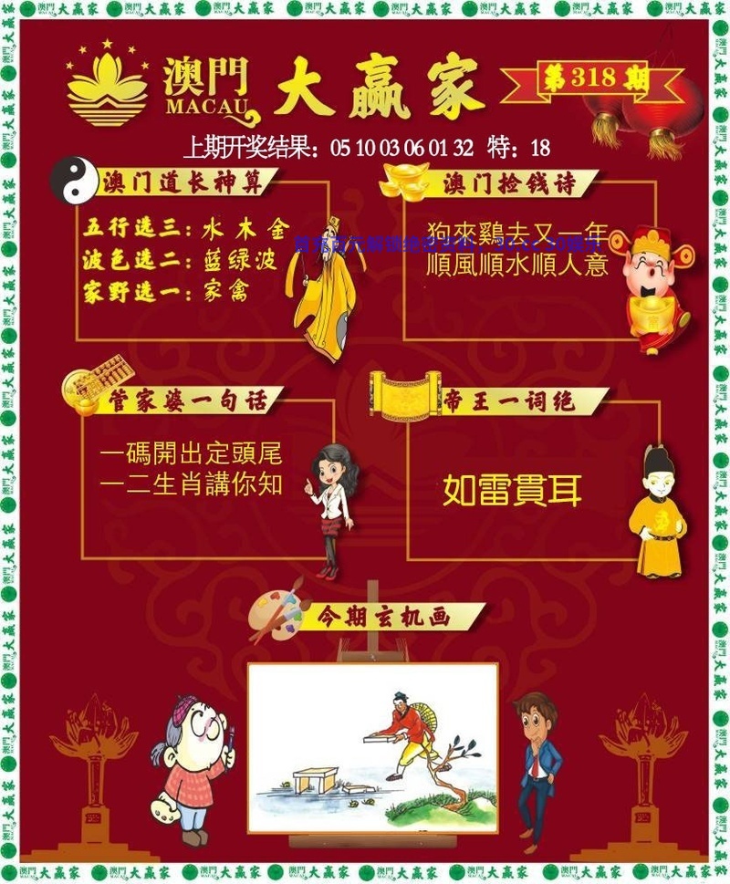 317期:今期生肖一九开,狗打老鼠无功劳。腊月冬季宰大猪,特定红绿满园春。六合中间问缘分,时来运转码中游。虎头蛇尾难成事,本期玄机诗中寻。 |